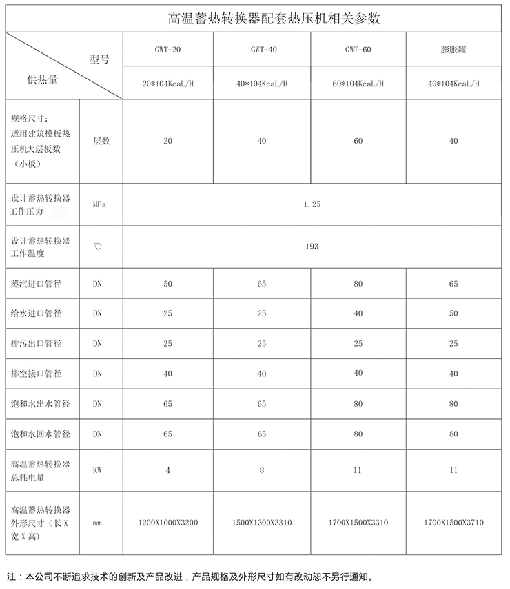 1.省電說明:因高溫蓄熱裝換器的熱量是由蒸汽鍋爐提供,與傳統飽和水蒸汽鍋爐比較,可取消高溫熱水循環泵的耗電量。 2.節能說明:高溫蓄熱裝換器配置鍋爐時,鍋爐尾部可采用帶壓節能器,降低尾部煙氣熱量,從而使尾部熱量得到完全利用。 3.改造性說明:把蒸汽給熱壓機供熱改造成飽和水給熱壓機供熱,設備改造簡單,只需安裝高溫蓄熱裝換器接入熱水管道進入熱壓機即可,無需更換管道。 4.通用性:用戶需要有蒸汽鍋爐或集中供熱的企業,為提升產品質量又節能,均可改造為飽和水給熱壓機供熱。